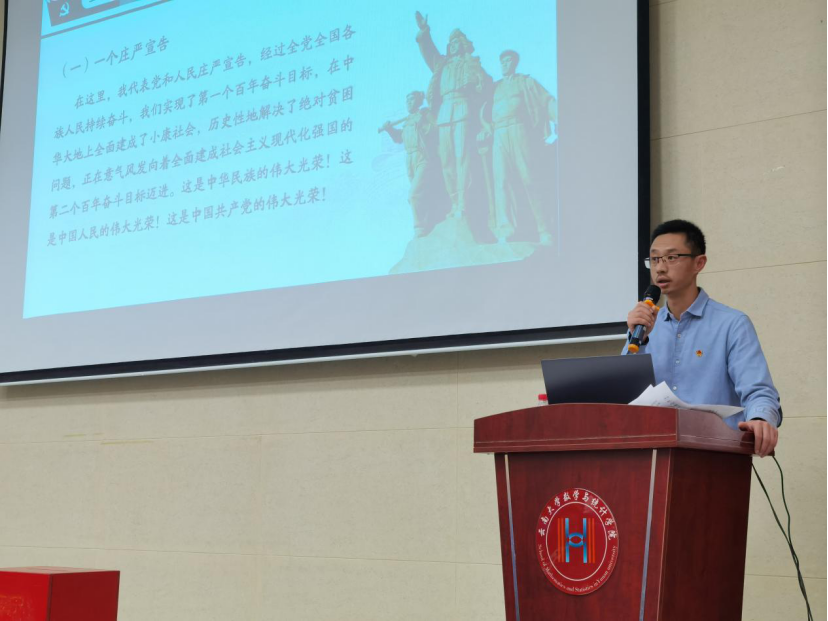 2021年10月29日下午15:00,bw必威西汉姆联官网数学与统计公司党委书记徐瑾在格物楼3103报告厅,带领公司全体党员师生一同学习了习近平总书记在庆祝中国共产党成立100周年大会上的重要讲话精神。