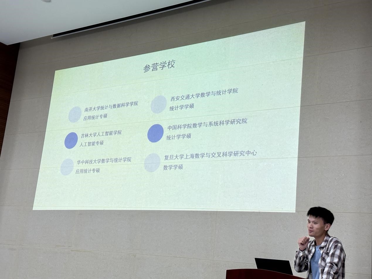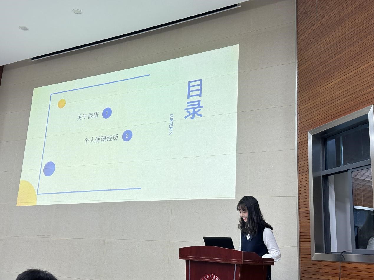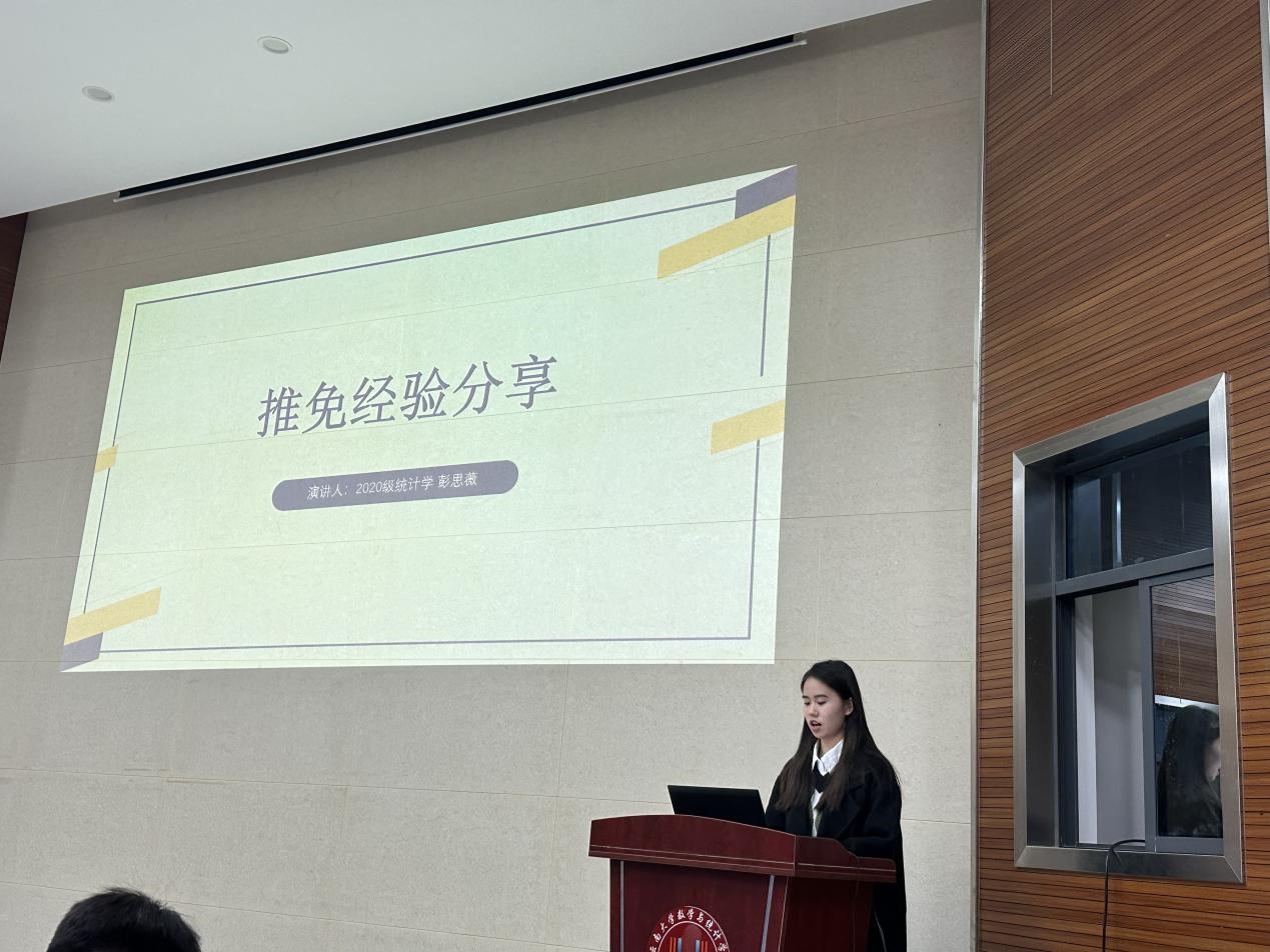 彭思薇学姐向同学们介绍了个人经历,还总汇出往届学长学姐的保研去向,告诉我们数统院保研名额属于上升趋势,鼓励我们打好基础,认真学习专业课,增大自己保研的机率。她具体介绍了推免条件需要综测平均分不低于80,GAP不低于2.8,四级考试成绩达到425以上。由于保研是一场持久战,她在时间方面也给出了宝贵的建议,需要从一月份开始就有清晰的规划一直到九月参加预推免以及填报志愿。从自己的保研经历,她建议学弟学妹们应该积极参加夏令营,保持良好的心态,收集各类与考研有关的信息。