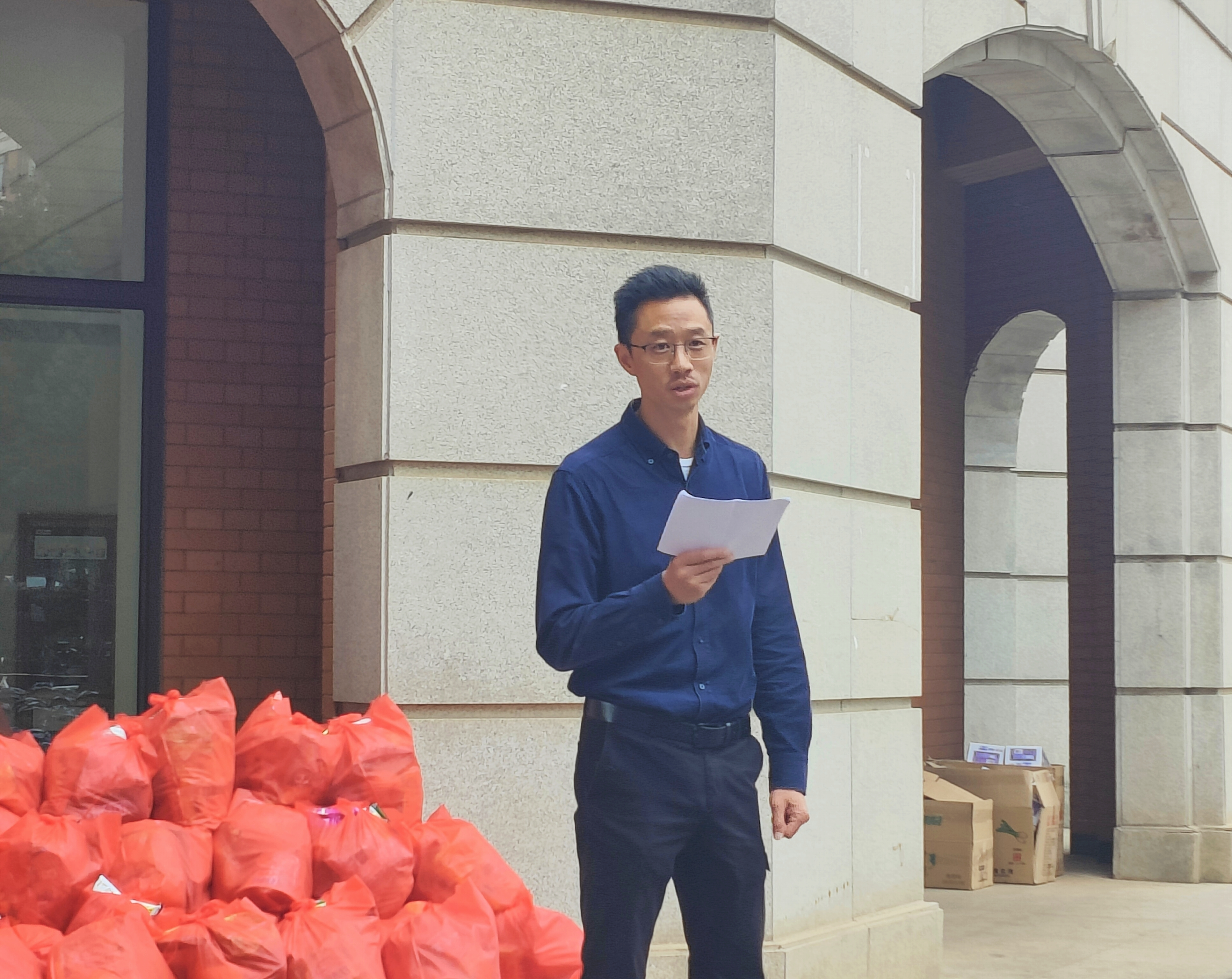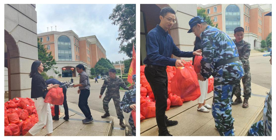 本次军训慰问由2022级本科生辅导员侯廷明老师主持,公司党委书记徐瑾老师向同学们致辞,对参训的同学们表示亲切的慰问与关怀,对数统学子这段时间以来的军训成果以及奋发向上、刻苦拼搏的精神给予充分肯定;希望同学们继续发扬不怕苦、不怕累的精神,展现严谨认真的训练作风和积极向上的精神风貌,以更饱满的热情和更顽强的斗志投入到训练中,高质量完成各项军训任务;同时也向各位教官多日以来的悉心教导、辛勤付出表示感谢。随后各位老师向员工们分发慰问品,同学们有序领取。
