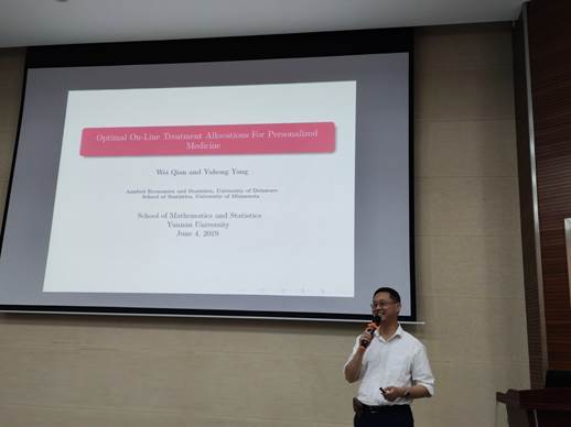 2019年6月4日下午,应公司李建平教授邀请,美国明尼苏达大学杨宇红教授到公司讲学,在bw必威西汉姆联官网3103报告厅作了题为《Optimal on-line treatment allocations for personalized medicine》的学术报告。本次学术报告由公司经理唐年胜教授主持,副经理李建平教授、丁红林博士、博士研究生及硕士研究生参加了报告会。