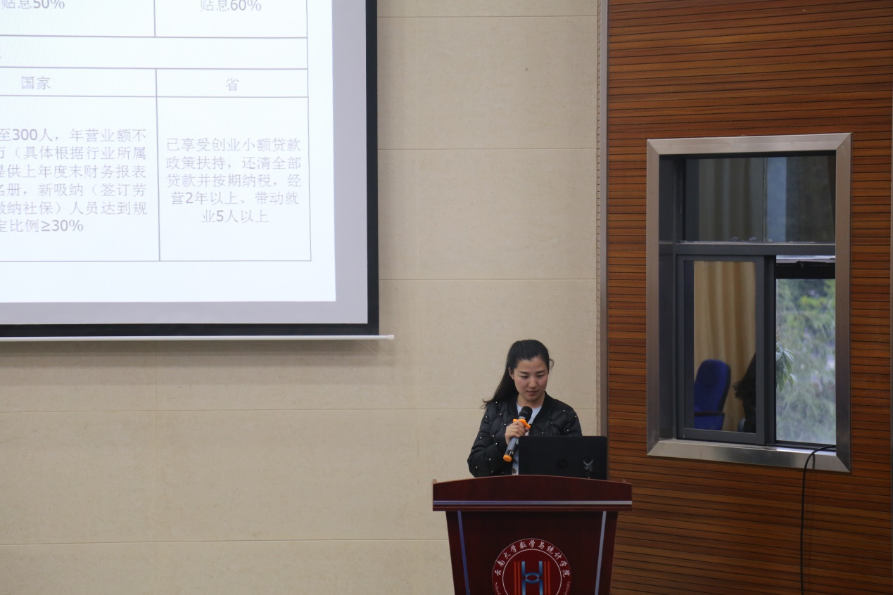 报告会开始前,闵亚楠做了一个简单的自我介绍,同学们对她有了简单的了解后,报告会正式开始。闵亚楠首先讲了老员工创业面临的问题及政府解决方案,并通过对当前社会状况的分析指出了老员工创业失败的主要原因是缺乏创业经验、系统的培训和指导以及创业资金不足。接着,她讲了老员工创业可得到的政策支持,企业经营合规的重要性,并介绍了云南省小微企业创业园区。让同学们对创业可得到的政策帮助有了进一步的了解。
