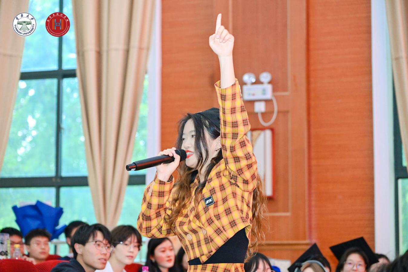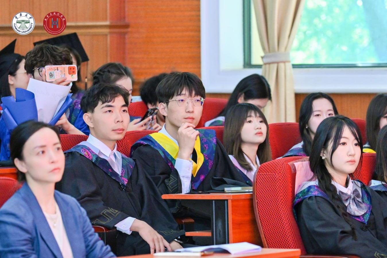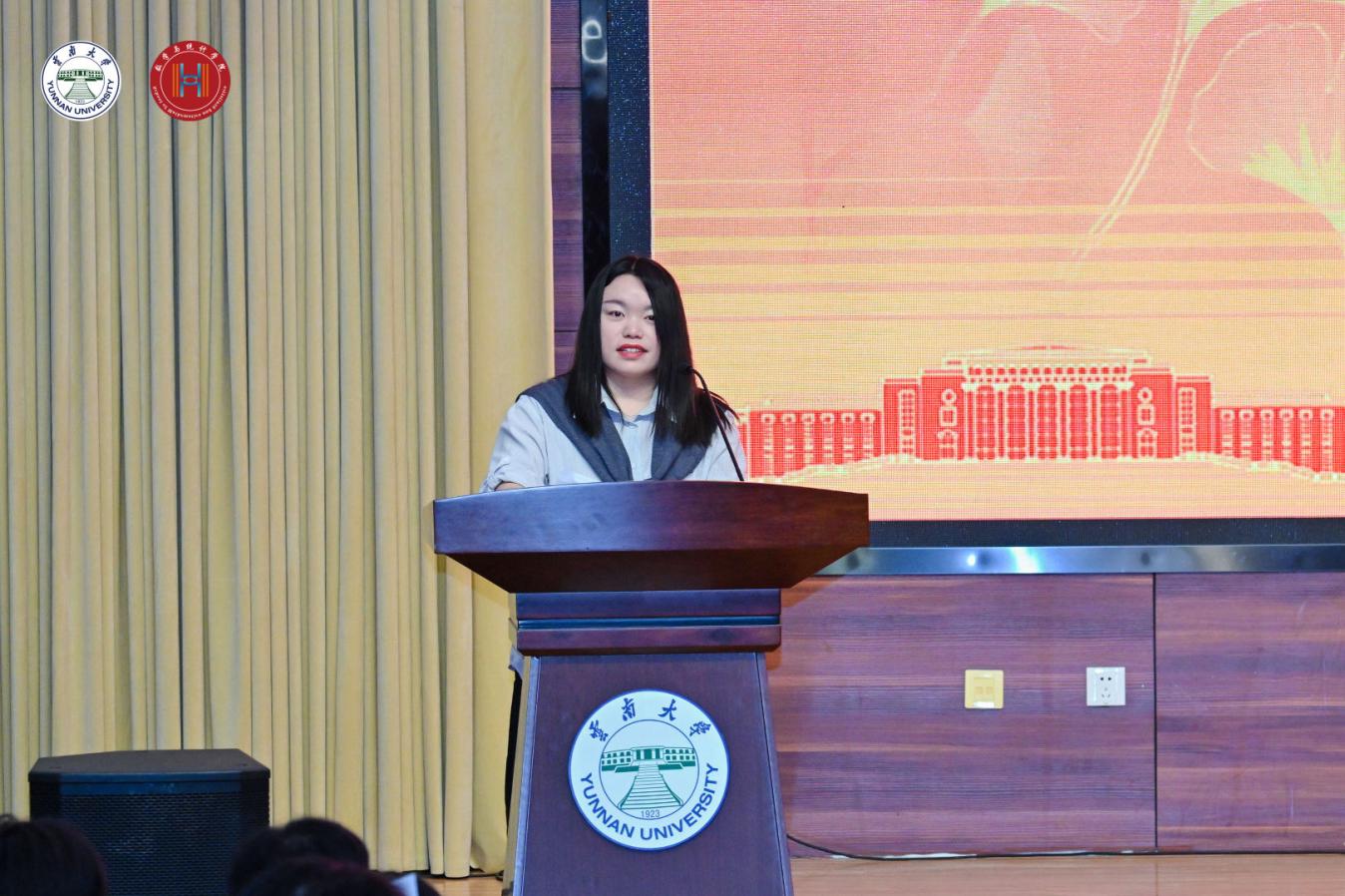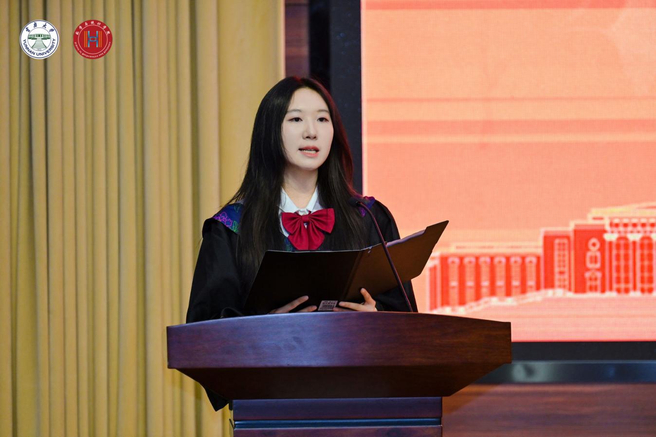 教师代表李素华发言谈到,往昔师生相处的片段,四年来的感受如电影般在话语间流淌,满含深情为同学们送上真挚的祝福:期许大家未来顺遂,将云大精神牢记于心,落实于实际,做可为之人。