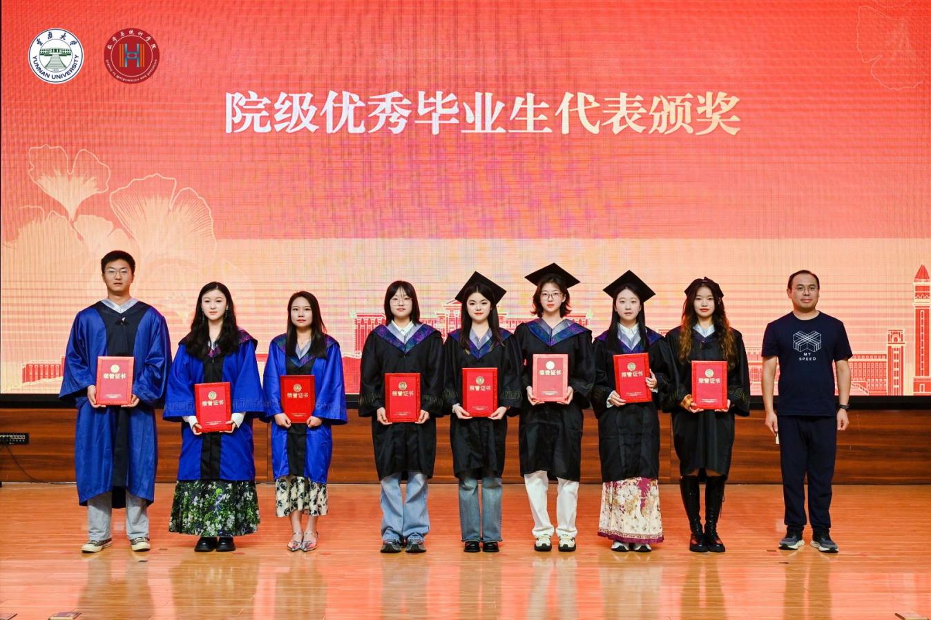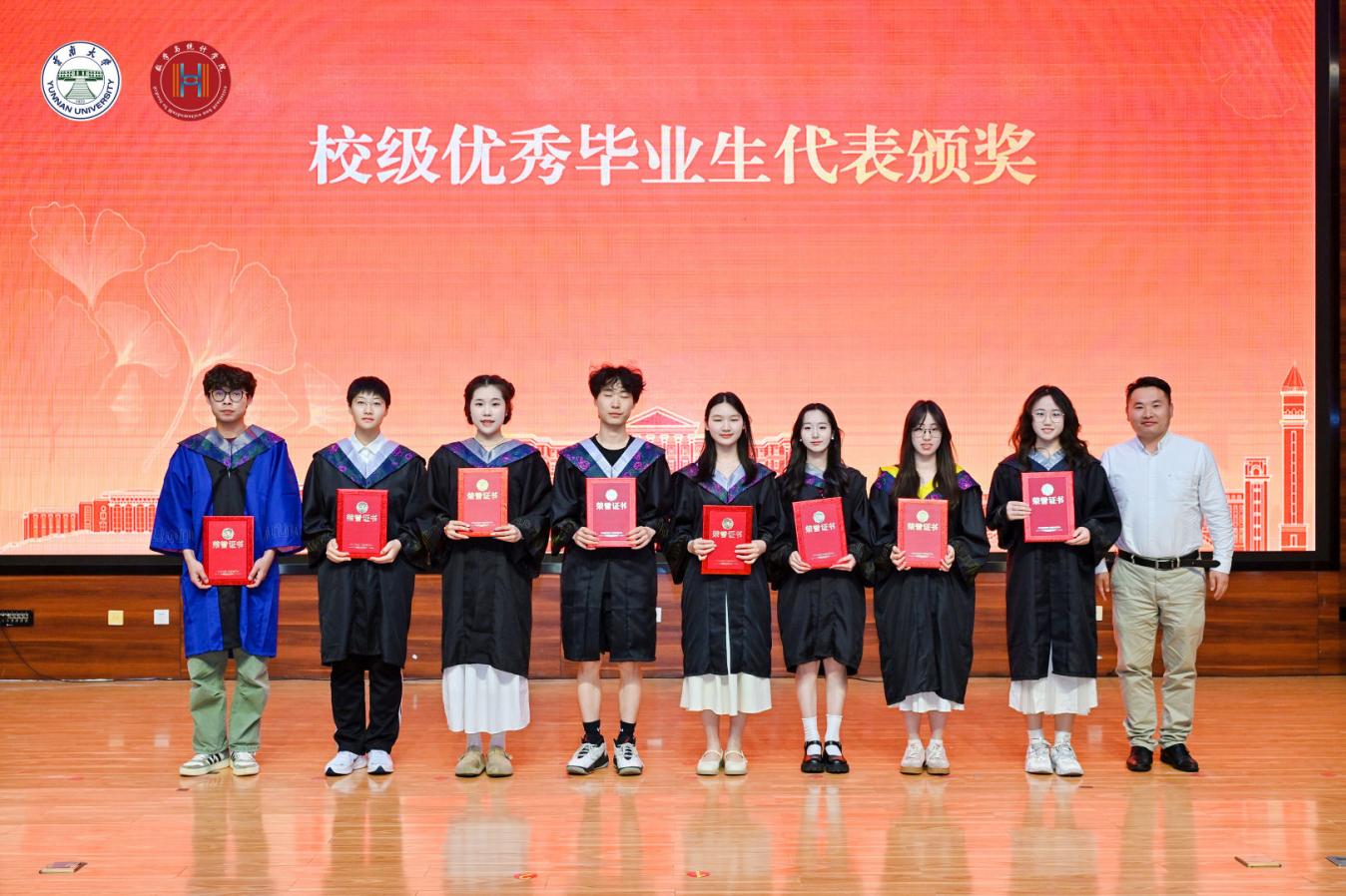 颁奖环节,省级、校级、院级优秀毕业生代表依次登台,在众人见证下接过荣誉证书,这是对他们大学期间努力的肯定,也激励着在场学子奋勇争先。