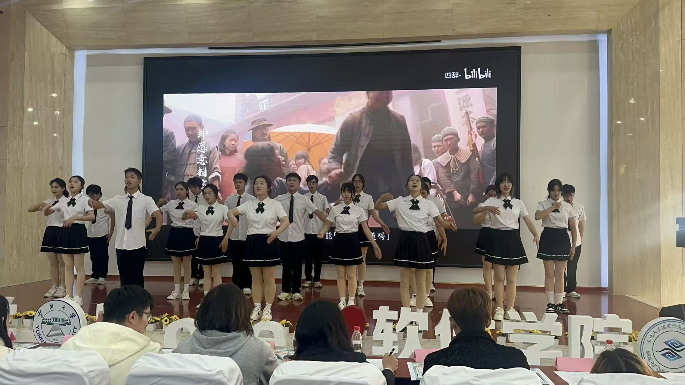 软件公司报告厅内,第十六届云大手语风采大赛正如火如荼地进行。宽阔的舞台被温暖的氛围所填满。当数统公司手语队的同学们指尖轻点,仿佛化作了穿越历史的星火;手势流转间,拼凑出逆境中不灭的希望。他们用手语舞演绎《光亮》中“坚守与寻光”的故事,生动展现了普通人在困境中向阳而生的勇气。以手语为“笔”,这份情感得到了更为细腻的表达——抬手是“冲破迷雾”的坚定,合掌是“拥抱微光”的温柔。每一个手势的起落,都在诉说着:无需畏惧黑暗,哪怕只是一点微光,也能照亮自己的路,更能汇聚成温暖他人的力量。